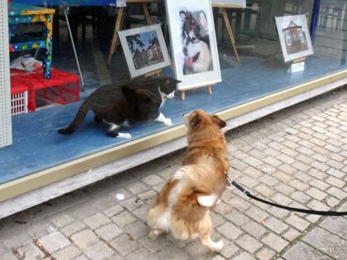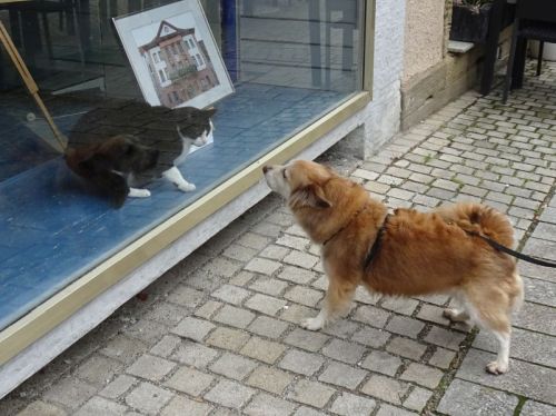 Die beiden haben sich angegiftet und auch die Katze ging gegen Carl bzw. die Scheibe, so dass ich dachte die Bilder fliegen alle durchs Schaufenster.