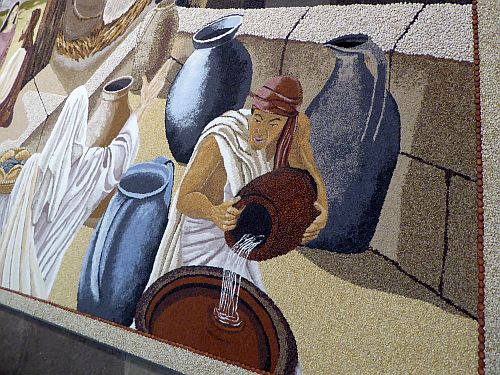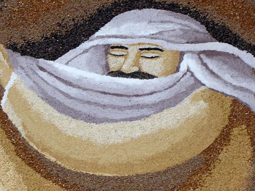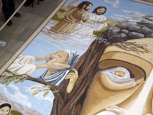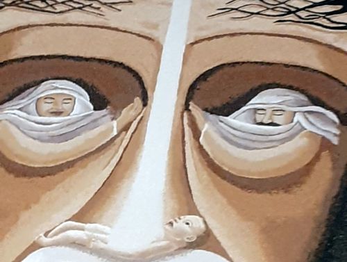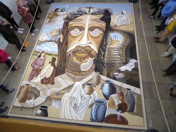 Das diesjährige Bild stellt das Leben Jesus dar, und mir gefällt das Bild eigentlich garnicht, denn durch die Bilder in den Augen und sowieso im Gesicht siehts einfach nur gruselig aus, auch wenn die künstlerische Idee vielleicht recht gut sein mag.