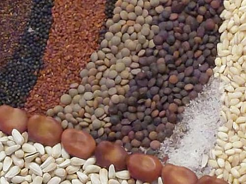 altes Gemälde aus Samen, Körnern, Früchten und gemahlenen Blüten nachgelegt. Auf