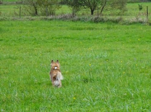 Carl springt gleich hektisch raus und freut sich dermaßen, wieder hier zu sein, dass er den Wiesenweg im Galopp nimmt.