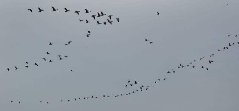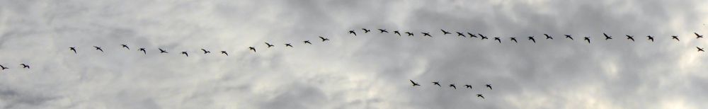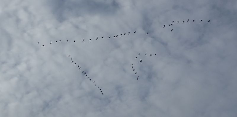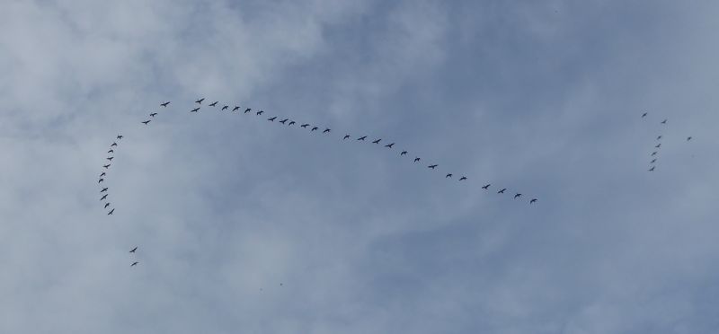 aber in Wirklichkeit sind sie inzwischen Standvögel und fliegen nur zum gemeinsamen Abendessen auf die umliegenden Äcker.