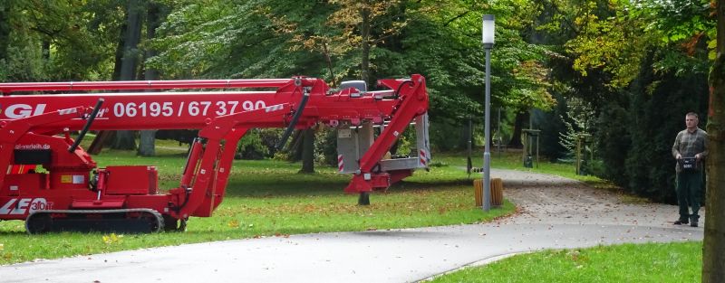 Ferngelenktes Männerspielzeug..... Im Kurpark wird das Totholz runtergeschnitten, bevor die Kurgäste erschlagen werden.