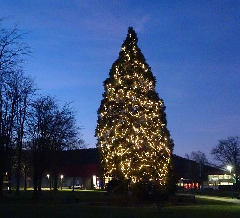 Also gibts jetzt ein Bild vom geschmückten Mammutbaum und dem Turm der Stolzenburg, der sich als Kerze verkleidet hat.