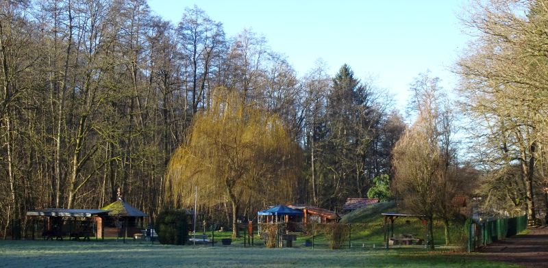 Stolzenberg, sehen wir vom Stellplatz aus. Die Beleuchtung der Therme erwischen