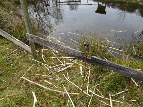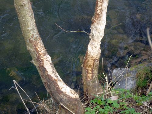 Überall liegen die abgenagten Stöcke herum, aber nebenan am Bach hat er seine Wasserrutsche und dort nagt der Vielfraß trotzdem noch die Bäume an.