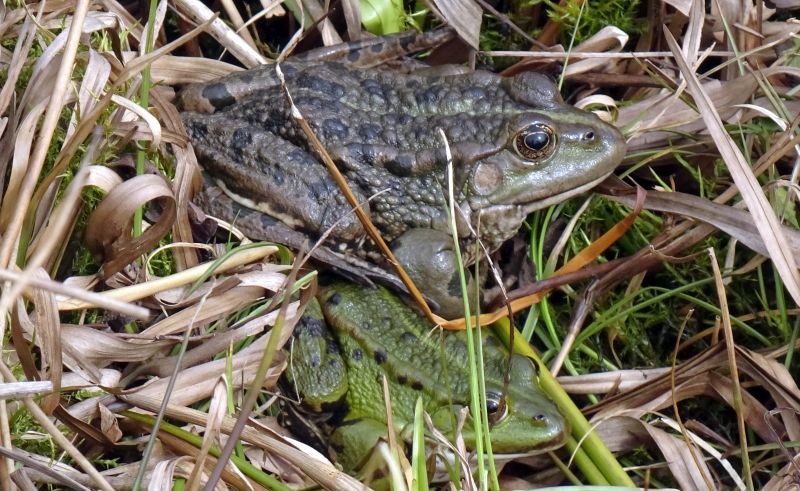 Den Eisvogel seh ich gerade noch unter der Brücke durchfliegen, aber die Frösche erwisch ich mit der Kamera. Die bleiben sitzen und gucken recht freundlich, wie sich das gehört wenn man geknipst wird.