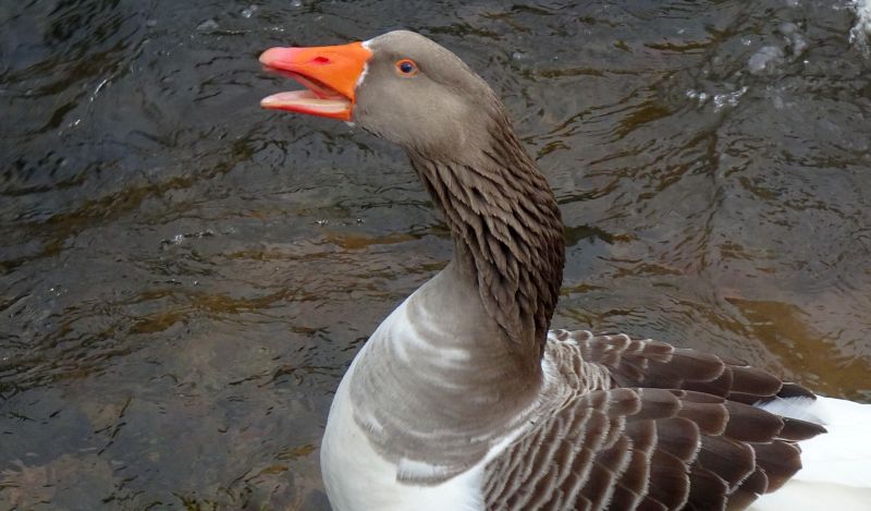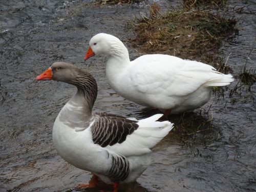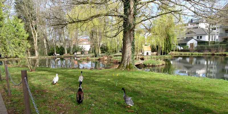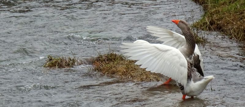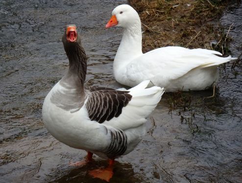Den nächsten Spaziergang machen wir am Bach entlang. Und da begegnen uns schon die hauseigenen Martinsgänse der Gaststätte.