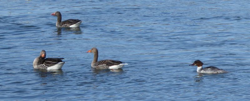 Hier hat sich ein Gänsesäger zu den Graugänsen gesellt.