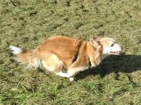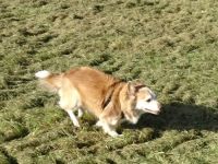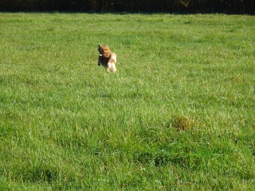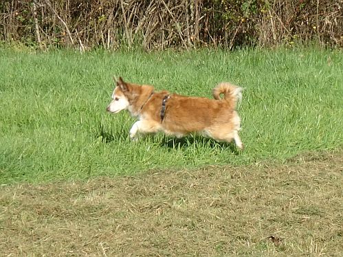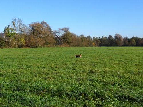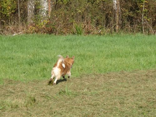 Natürlich müssen wir gleich mal ins Feld, denn Carl braucht Auslauf. Im Mäuselsprung hüpft er über die Wiese