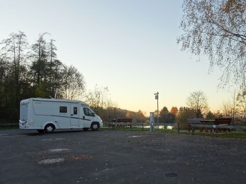 Um 15:00 fahren wir dann weiter, wir wollen in Ulrichstein, dem höchsten Dorf im Vogelsberg, den Sonnenuntergang erleben. Nach einem harten Ritt bergauf bergab über winzige Sträßchen landen wir auf dem Stellplatz, der aber leider weit weg von jeglicher menschlichen Behausung leer und verlassen daliegt.