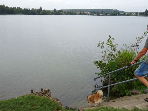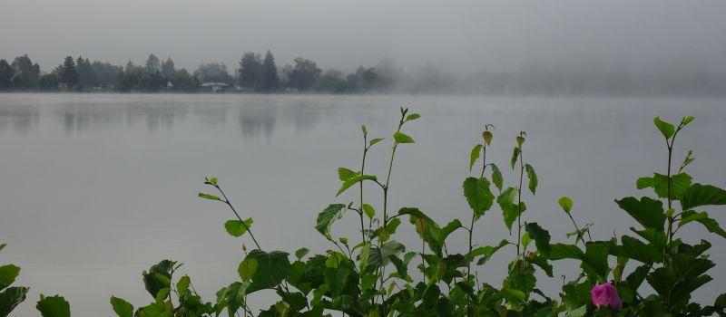 Gutgelaunt marschier ich kurz vor 7:00 mit Carl an den See, der noch im Nebel liegt.
