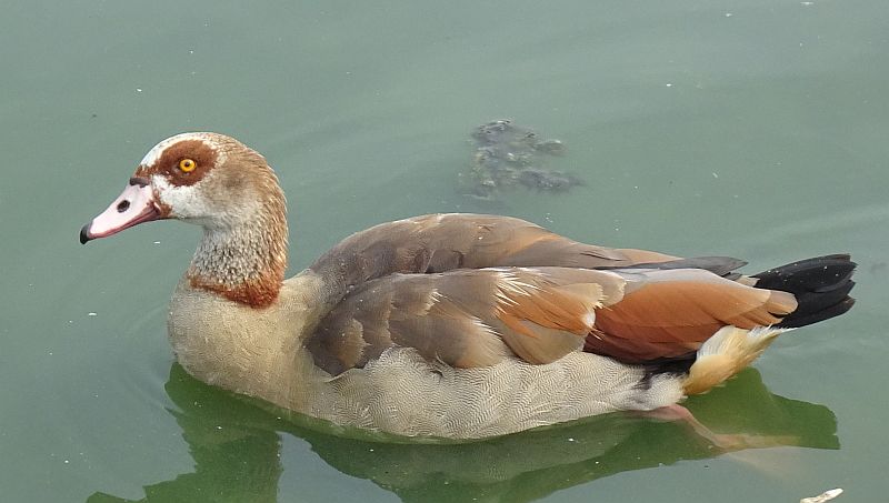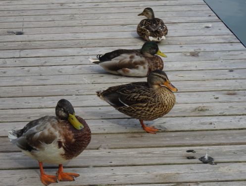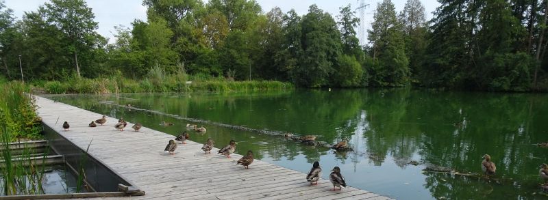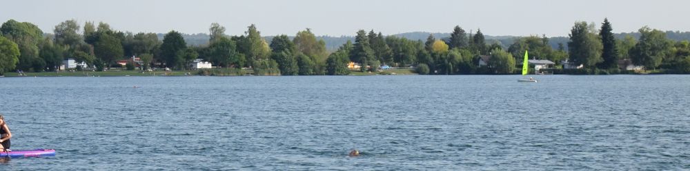Die Entenfamilie genießt es, dass der Badestrand leer ist. Und Carl darf kurz vor Hälfte der Strecke auch mal ins Wasser. Rechts von der oberen Bildrandmitte wohnen wir.
