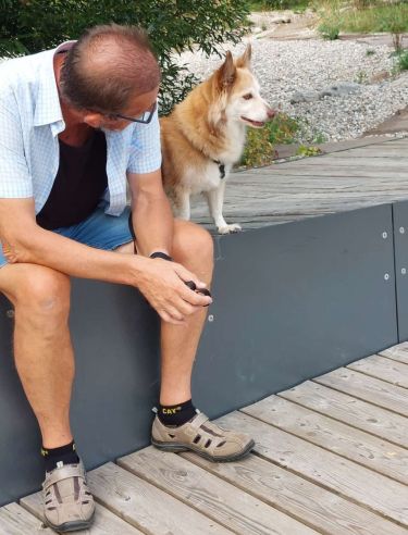 Das Wetter passt, es ist bedeckter Himmel und angenehme 23°, und unser Platz hat sogar Sat-Empfang. Der Nachbarhund ist nett. Was will man mehr.