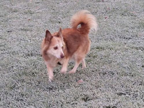 Nach einem zartrosa Sonnenaufgang geh ich mal mit Carl über die tiefgefrorene Müllerwiese.