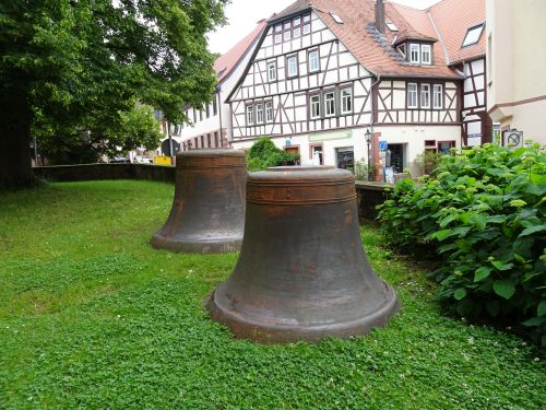 auf der Treppe zur Kirche rum. Und im Kirchhof liegen diese alten Glocken rum,