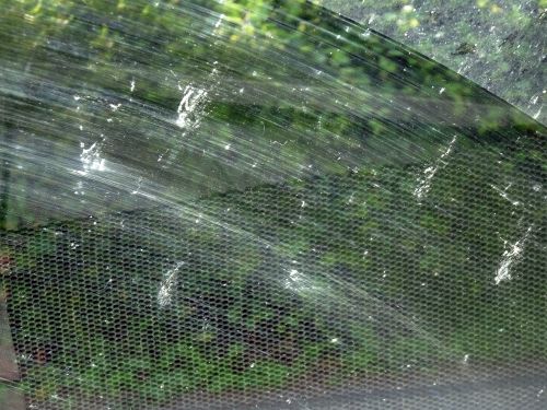 unsre Scheibe. Alle 5 cm klare Flüssigkeit, wie große Wassertropfen, die sich allerdings nicht mit dem