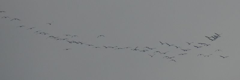 Als erstes kommen die Kraniche fröhlich kreischend drüber. Ein Zug nach dem