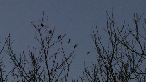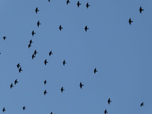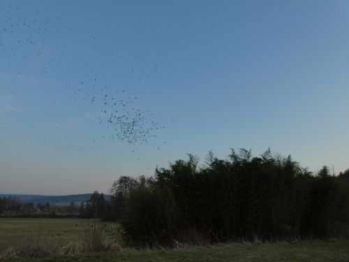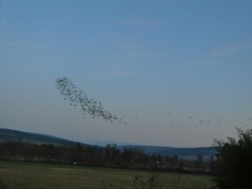 Ab und zu kommt mal ein kreischender Schwarm Kraniche vorbei, bis das Spektakel mit den Staren plötzlich anfängt.