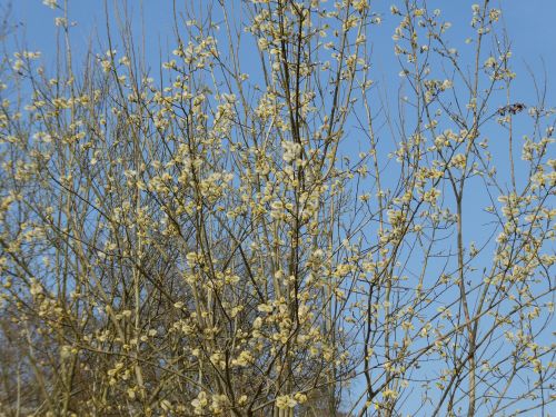 Die Weide treibt schon kräftig Kätzchen und Blätter,