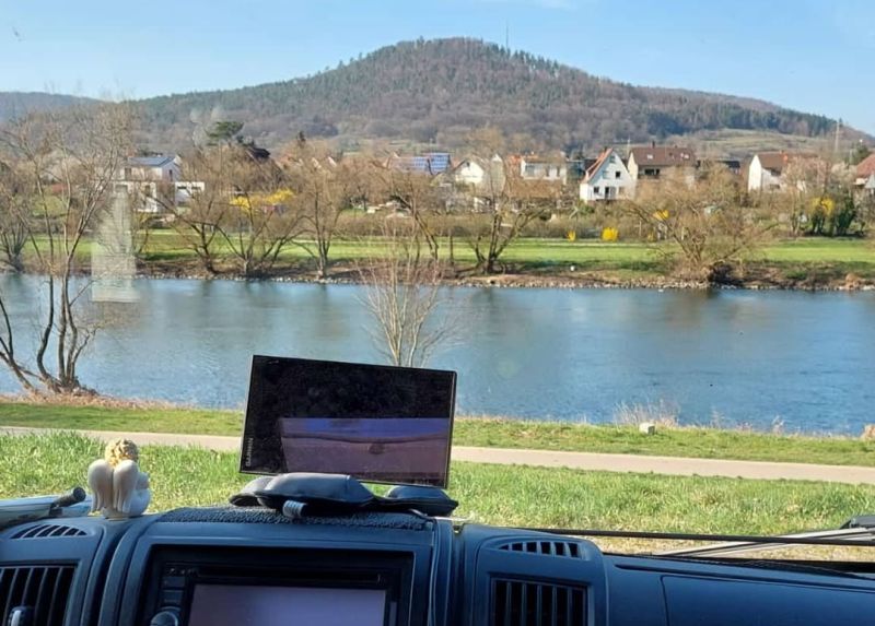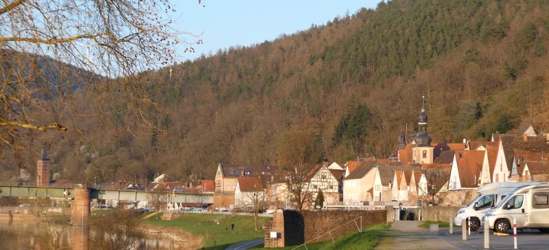Aber leider war der Parkplatz belegt, und wir fahren deshalb weiter nach Hirschhorn, denn in der Pfalz machts keinen Sinn. Hier überschwemmen ab heute alle Womos Deutschlands die Stellplätze, weil alle die Mandelblüten und die Feste besuchen wollen.