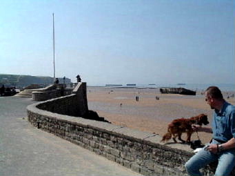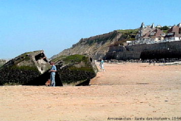 von hier draußen auf Arromanches und das auf einem Plateau liegende D-Day-Kino.