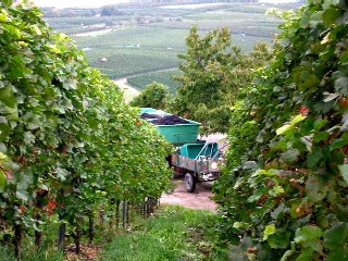 Die Weinlese ist um diese Uhrzeit bereits voll in Gang und es ist echt befremdlich zu erfahren, dass nur eine gewisse Menge Trauben geerntet werden darf und daher die restlichen, die nicht ganz so toll aussehen, einfach abgeschnitten und liegengelassen werden. Massenhaft vergammeln die süßen dunkelblauen Früchte unter den Rebstöcken. Einige hab ich retten können, aber mehr als 2 Hände voll konnte ich nicht essen. Für Peter hab ich auch noch einen wunderbaren Birnbaum gefunden und nach dem Frühstück mussten wir nochmal gemeinsam einen Spaziergang machen, denn ich war zu klein zum ernten der Birnen.