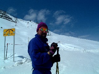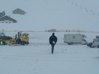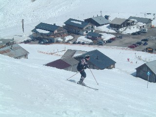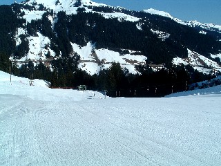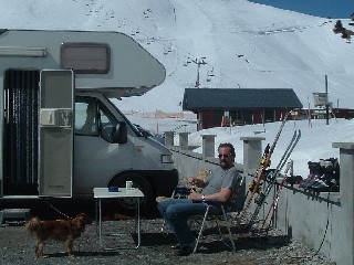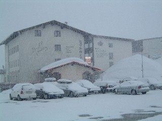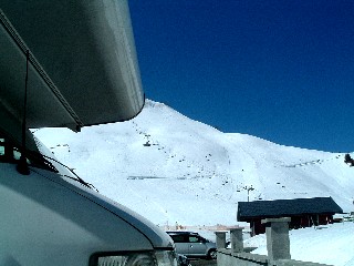 Nach dem Abendessen inspizieren wir mit Bruno im Dämmerlicht die Piste, die von unserem Parkplatz nach unten geht. Hier ist also die Endstation des Liftes. Gegenüber walzt die Pistenraupe die Steilhänge, die im Scheinwerferlicht noch steiler aussehen als vorhin. Keine Ahnung, ob wir hier morgen Skifahren, oder ob wir uns nur in die Sonne setzen. Irgendwie sind die Abfahrten wesentlich steiler als in Saalbach, Zermatt, Hintertux und Stubai. Aber egal, das überlegen wir morgen. Jetzt gibts einen gemütlichen Tagesausklang vor der Glotze, denn wir sind ziemlich kaputt. Zu bemerken ist noch, dass wir hier am Arsch der Welt sitzen, es gibt keinerlei Einkaufsmöglichkeit, kein Rummel, absolute Ruhe und Einsamkeit.