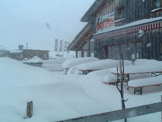 Durch den Schneesturm kämpfen wir uns die 30m zum Rössle und setzen dort die eingesparten Liftkosten in Nahrung um.