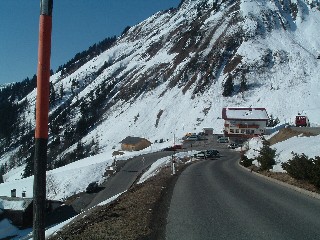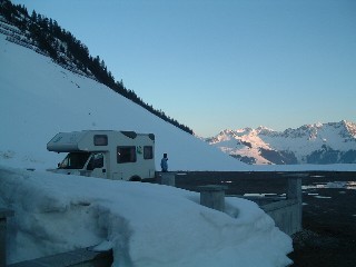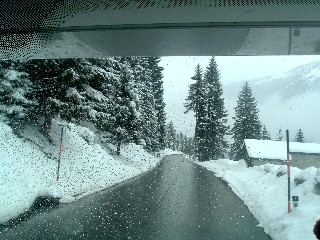 Zur Abwechslung schneits immer noch und unser Abfluss ist auch noch zu. Wir sind genervt und gegen 15:00 entschließen wir uns zur Weiterfahrt in die Schweiz. Pro forma schnell noch mal nach den Papieren geguckt....und die Panik bricht aus: keine Fahrzeugpapiere im Mäppchen. Kann eigentlich nicht sein, die nehmen wir nie raus. Nachdem alle Verstecke durchsucht sind und die Nerven endgültig blank liegen, fällt uns der TÜV-Besuch im März ein und wir finden die Papiere in der Türablage. Also jetzt nix wie weg und kurz vor 20:00 treffen wir auf dem CP Chur ein. Die Fahrt durch den Bregenzer Wald war bei weitem nicht mit der aufregenden Anfahrt aus dem Süden zu vergleichen. Normale Straßen und nur ein kurzes Gefälle von 14%.