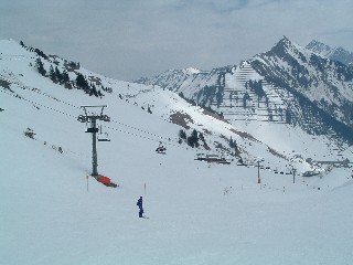 Unterwegs stellt sich heraus, dass der sichtbare Teil des Lifts nur der Anfang ist, denn oben geht er nochmal doppelt so lange weiter in ein herrliches Skigebiet, wo sich nur ganz wenige Skifahrer tummeln. Anfangs sind wir noch vorsichtig auf der unbekannten Piste unterwegs, aber dann klappts plötzlich wieder prima und macht irre Spaß. Allerdings sind wir gegen 13:00 schon fix und alle, der Schnee wird langsam schwer und es ist Zeit zum Feierabend machen.