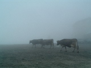 Jetzt ziehen aus dem Tal die Wolken langsam hoch und mein unverbaubarer Ausblick auf die andere Talseite sieht leider nun so aus, und auch das tägliche Kuh-Gassi findet im Nebel statt: