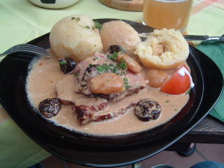 Bevor wir unseren Stellplatz beziehen, stärken wir uns auf dem Festplatz im Kurpark mit einer Bauernpfanne aus Pilzen, Fleisch, Gewürzgurken und Sauerrahm. Den Rest des Nachmittags verbringen wir vor dem Womo im Schatten der Markise.