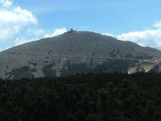 Von der Ausstiegsstelle bis zur Koppe führt entweder der Zickzackweg mühsam bergauf, alternativ dazu kann man auch den Jubiläumsweg, der oben auf dem Bild gut zu sehen ist, etwas bequemer zum Gipfel gehen. Beide Wege sollen aber in der angegebenen Zeit von 45 Minuten eher nur im Laufschritt zu schaffen sein. Peter macht ein paar Bilder und kommt durchgefroren wieder runter.