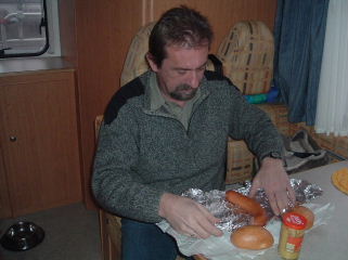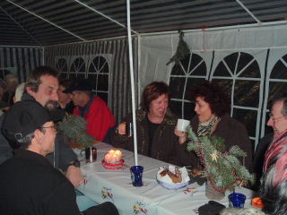 Nach einem Begrüßungsplausch in unserer Schnecke meldete sich unser Magen und etwas verspätet gabs Burgunderbraten mit Klößen. Danach ein Spaziergang mit Bruno und Chama, die sich dabei gottseidank nicht mal angeschaut haben. Nachdem beide wieder verfrachtet waren, gabs im Gemeinschaftszelt einen Apfelpunsch. Eigentlich hat dieser Stellplatz so langsam Dauercampercharakter, denn alle kannten sich irgendwie und verbringen wohl immer die Feiertage hier. Aber es war recht unterhaltsam.