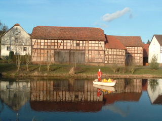 Alle Fachwerkhäuser sind irgendwie schief, aber liebevoll restauriert, auch die Schnitzereien an den Hausecken und die Sprüche der Erbauer. Die Pisa-Leute hätten ihre Freude daran. Die Fahrt hat sich wirklich gelohnt und wir sind alle Gassen abgelaufen. Aber übernachten wollen wir heute mit Strom und fahren deshalb nach Otterau. Die Straße dorthin wird immer schmaler und wir fragen uns, wozu hier mitten in den Äckern ein Stellplatz sein soll. Aber am Dorfrand kann man tatsächlich beim Schwimmbad stehen und drei Stromanschlüsse sind auch da, allerdings ohne Strom. Das Sportheim ist offen und wir suchen den Sicherungskasten, finden ihn aber nicht. Nach Aussage einiger Einheimischer stand hier wohl noch nie ein Womo und keiner weiß nix genaues. Also fahren wir weiter und landen bei Dunkelheit auf dem Stellplatz vor dem ***** Campingplatz SeePark bei Kirchheim. Mit 14 € nicht ganz billig, aber Dusche und Strom mit drin. Schwimmbad, Pool, Rollschuhdisko und Kinderbetreuung gibts auch, brauchen wir aber nicht. Peter hat grad ein Glas Salzgurken niedergemacht, während sich Iris Berben in Afrika rumtreibt. Ein gemütlicher Womo-Abend, es tröpfelt leicht aufs Dach und wir sitzen schön warm und kuschelig. Urlaub.