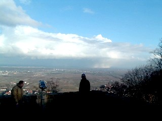 Hier werden wir mit einer Wahnsinnsaussicht belohnt. Zum Rhein hin ist der Himmel schwarz und davor kann man die einzelnen Schneeschauer ziehen sehen, während wir den schönsten Sonnenschein haben.