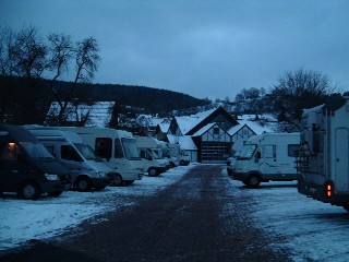 Der Stellplatz ist rappelvoll, aber wir finden ein schönes Plätzchen am Rand. Zur Begrüßung gibts bei Stefan und Kerstin an der Bude einen oder zwei oder drei Glühweine und gleich drauf trifft auch Bernd ein, vorläufig allerdings nur mit dem Fahrrad. Um 18:00 ists Zeit fürs Abendessen in der Tenne. Es gibt Hausmacher und frisches Zwiebelbrot. Danach macht Bernd eine Nachtwanderung und holt sein Mobil und wir machen eine Fackelwanderung zum Glühweinlagerfeuer.