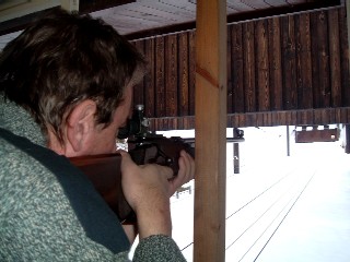 Nach Peters Schießkünsten machen wir uns aber wieder auf den Heimweg, denn es dauert uns zu lange, bis jeder eingewiesen ist und endlich seine 5 Schuss abgibt. Inzwischen setzt Tauwetter ein und es fängt an zu nieseln. Schade.