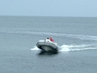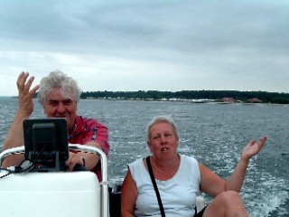 Bisschen mulmig wars mir schon, denn 60 PS sind ne Menge Zeugs und beim Beschleunigen steigt das Boot vorn ganz schön hoch aus dem Wasser. Gottseidank gibts genügend Festklammermöglichkeiten und dann machts richtig Spaß und Damp ist nur noch ganz klein und weit weg. Um mich ein wenig aus der Fassung zu bringen, fährt Günter gekonnt noch ein paar scharfe Kurven und nen Kreis, und die zwei Männer haben ihren Spaß daran, wie ich mich festklammere. Aber ich hab ja inzwischen kapiert, dass nix passiert und es war eine tolle Fahrt - schöner als Motorradfahren.