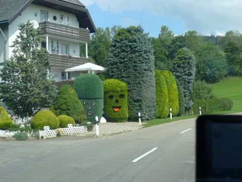 Unterwegs kommen wir an dieser lusdischen Hecke vorbei. Die Gesichter bestehen aus angemalten Körbchen, die in freigeschnittene Löcher der Thujas gesteckt wurden. Das ist ja mal eine nette Idee.