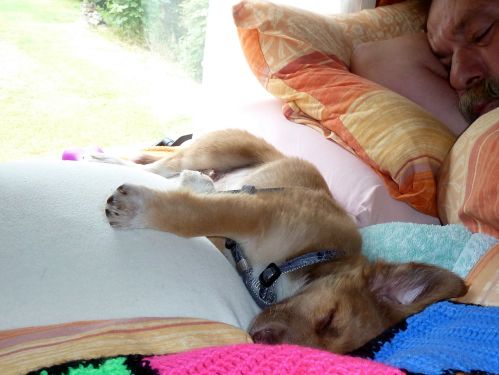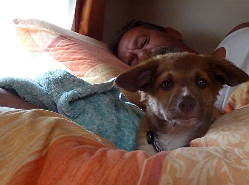 hat er gut 3 Eßlöffel Bozita reingeschlabbert, kurz raus zum Pipi auf Kommando, und sofort ist er wieder Richtung Womo gelaufen, mir an der Treppe aus der Hand ins Womo gesprungen und schnurstracks in die Box, umgefallen und weitergepennt.