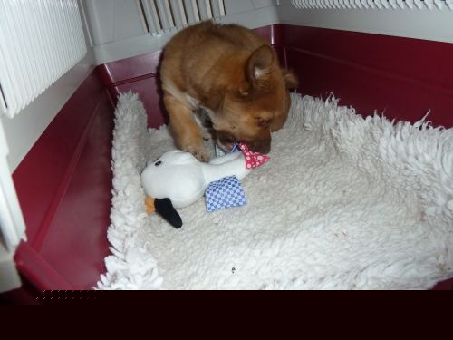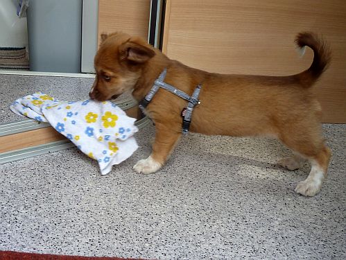 Nach dem Frühstück jagte er meinen Putzlappen und hat ihn anschließend geklaut und auf seine Decke geschleppt.