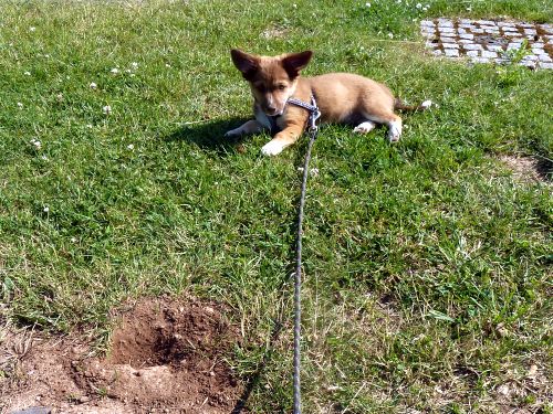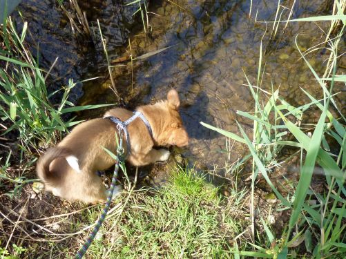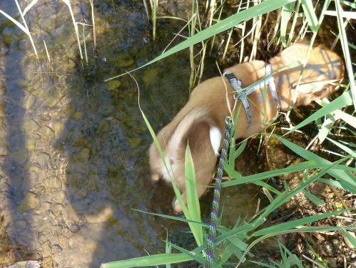 und fing an sich einen Tunnel zu graben. Ich denke, er will unterm See durch. Aber erst zeigen wir ihm mal das Wasser. Er geht auch tapfer mit und ist nicht im geringsten beeindruckt. Er steigt rein und will gleich ins Schilf latschen.