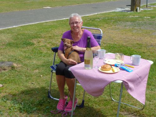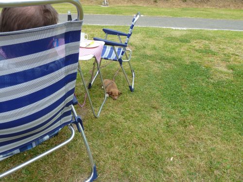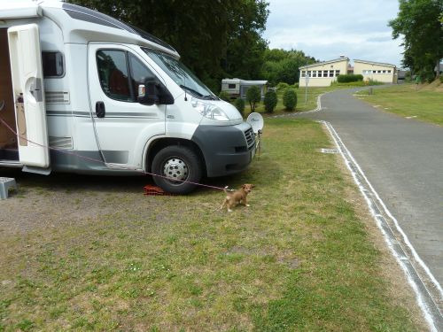 Am Platz kommt er kurz raus, schlabbert ein wenig Wasser, und verzieht sich wieder und pennt weiter bis wir fertig eingerichtet sind. Braver Hund.