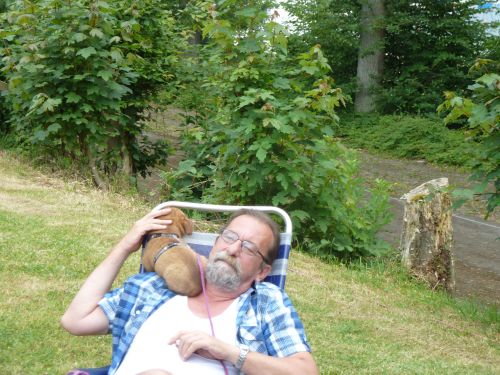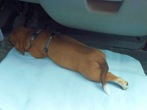 Gegen später fängts an zu tröpfeln und wir müssen rein. Carlchen hat sofort seinen Platz im Fußraum vorn gefunden und liegt nun da wie geschossen. Er lauscht dem Getröpfel aufs Dach, dem Lieblingsschlaflied der Womofahrer.