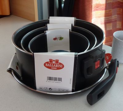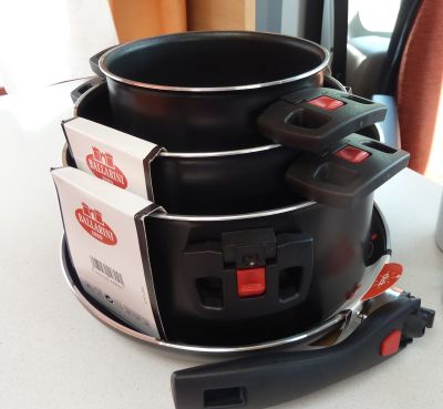 Beim Campingzubehör werden wir aber fündig, und ich hab jetzt endlich perfekte Töpfe. Der Griff ist klappbar, und auch der Pfannengriff klappt weg, und jetzt passt die große Pfanne in den Schrank.