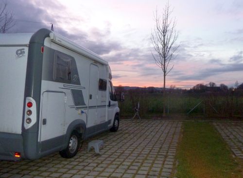 Nach zweieinhalb Stunden Fahrt durch Friede-Freude-Eierkuchen-Landschaft sind wir in Bad Griesbach gelandet und stehen nun mit drei anderen draußen auf dem Stellplatz mit Blick ins Feld. Passt.