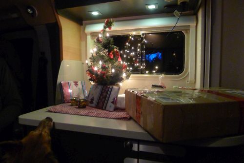 Nach einem Cappu und Weihnachtsplätzchen machen wir einen Spaziergang, und dann lassen wirs für heute gut sein und machens uns gemütlich, d.h. Carls Box unterm Tisch verschwindet und er muss sich nun umgewöhnen. Er wohnt jetzt tagsüber auf dem Beifahrersitz und nachts darf er auf dem Kissen im Flur schlafen, denn im Fußraum vorn ists recht kalt.