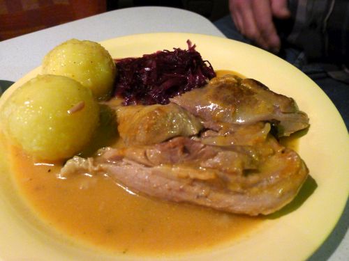 Abends gibt Putenkeule, Rotkraut und Klöße,