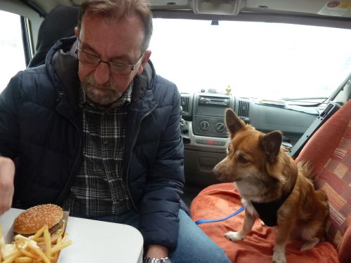 Als wir jedoch auf der Höhe unsres Zieles sind nieselt es immernoch, die Wolken hängen tief, und wir verwerfen das Vorhaben, denn nochmal 3 Tage überwiegend im Womo rumsitzen wollen wir nicht. Da sitzen wir daheim bequemer und Carl kann sich auch wieder mehr bewegen.